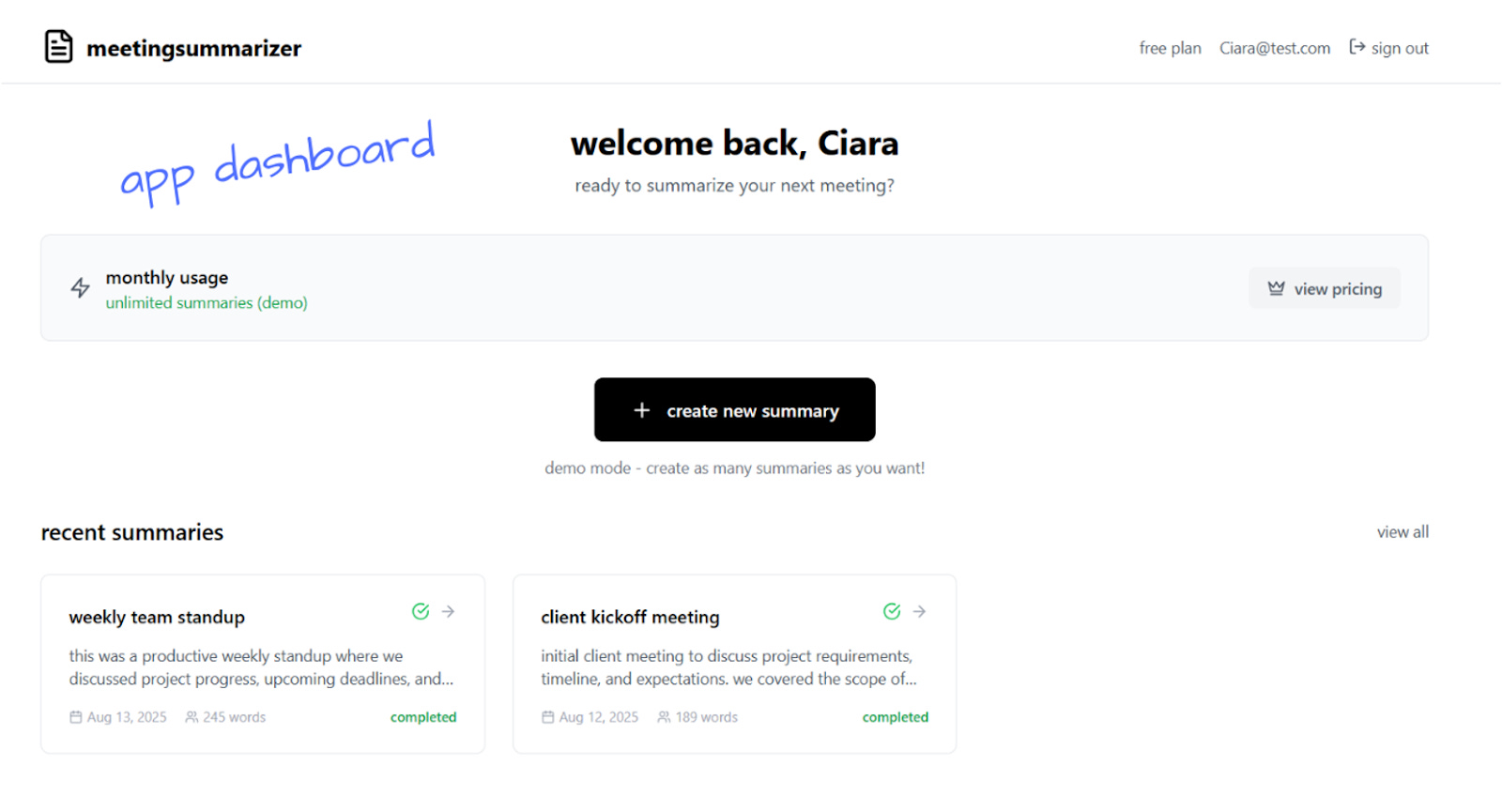 "Add a dashboard to view all previous meeting summaries"