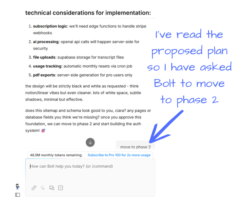 This prevents Bolt from rushing ahead and allows you to review each development phase.