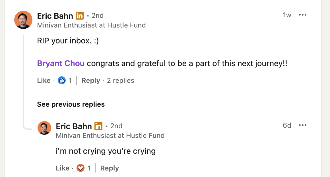 Eric is a pretty prolific investor who regularly posts on Linkedin. I think chances are high that if you’re able to impress him via cold email, he would respond, and he could then potentially introduce you to Bryant, or some other company in his portfolio that is hiring. So what if you spent 30 minutes figuring out how to prove to Eric that you have high agency and can get things done?