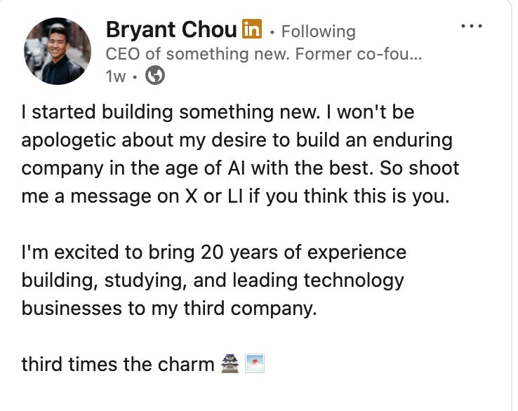 Scenario 2: You see Next Play’s recent newsletter that Bryant Chou, the former founder/CTO of Webflow (multi-billion dollar startup) is starting a new stealth company, and is looking for a chief of staff.