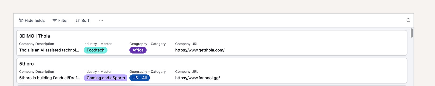 One simple idea: you could look up that Eric helps run something called Hustle Fund. You could go on Hustle Fund’s website and find their portfolio. You’d see that they list some of the companies they’ve invested in in an Airtable.