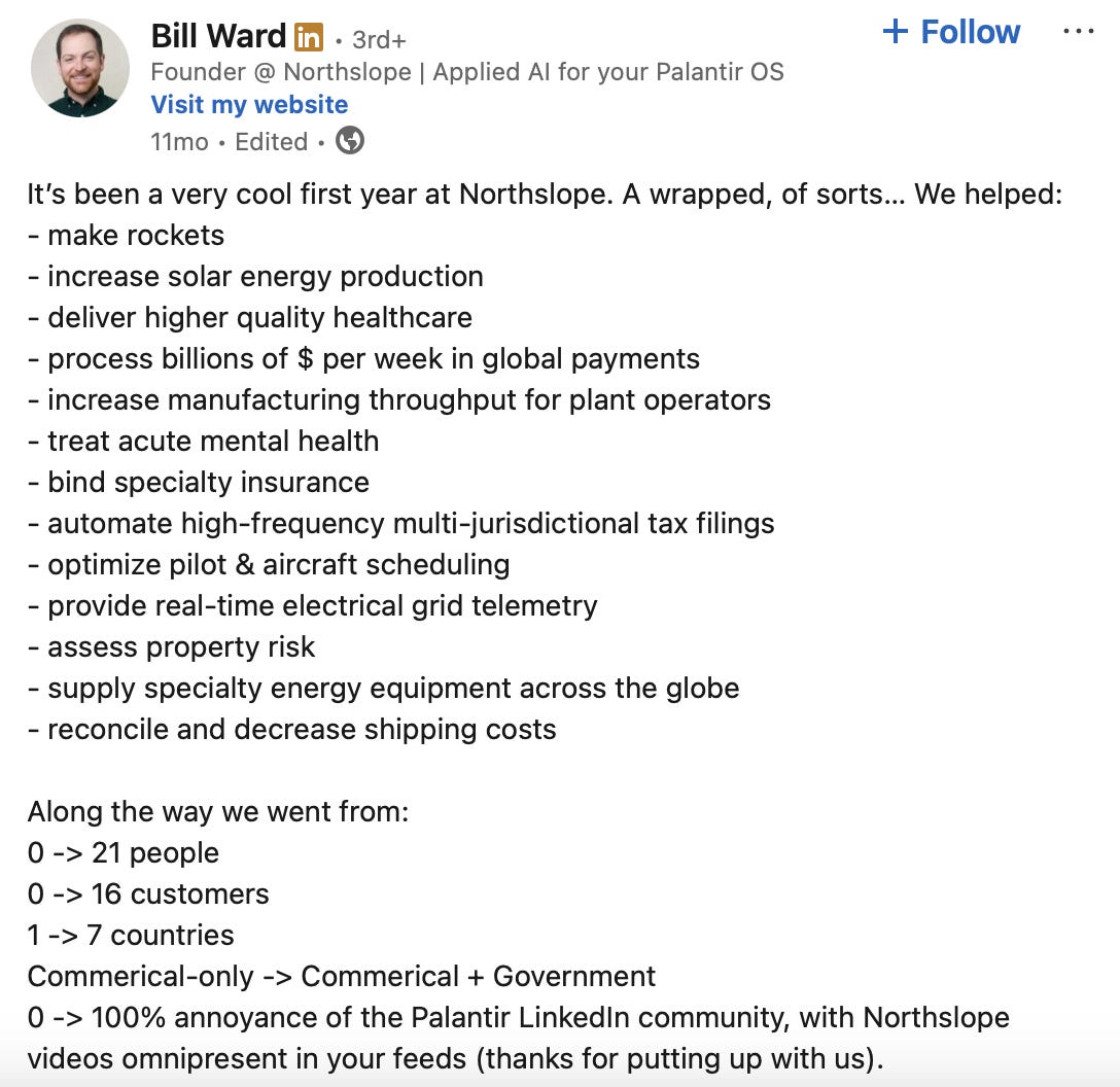 One year after founding Northslope, Bill Ward posted the following on his LinkedIn: